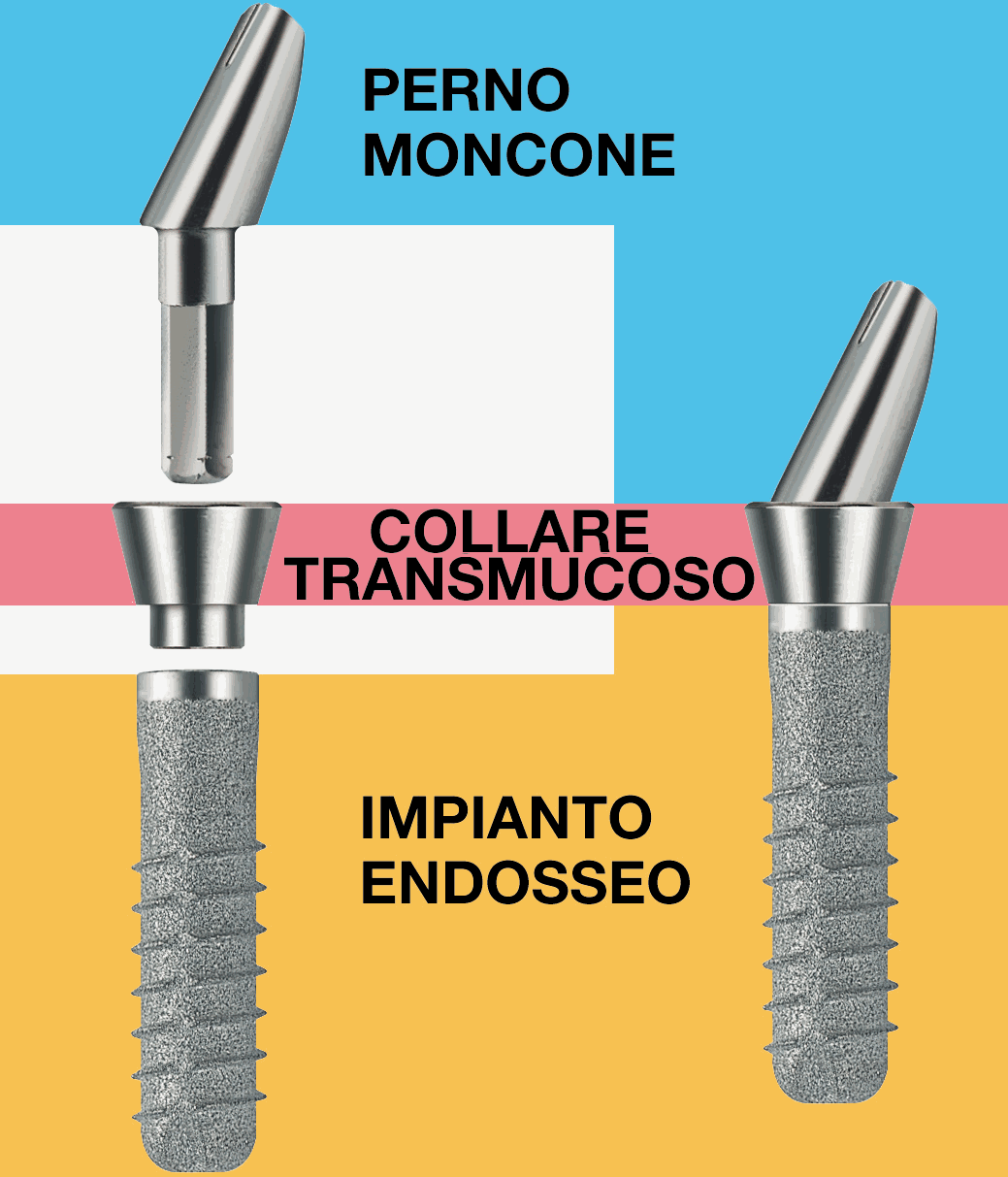 2 - Integrazione a livello mucoso Il collare transmucoso, connesso a frizione con l’impianto, ne rappresenta il naturale prolungamento attraverso i tessuti molli. |